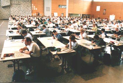 Les parties de Scrabble se sont disputées au gymnase municipal jusqu'en 1993. A la table 1, Pascal Fritsch est confiant, son avance est suffisante. Table 2, Bernard Caro cherche jusqu'au bout pour prévenir la menace des Lorrains Régis Marczak et Francis Leroy qui le talonnent. Plus loin, Jean-Pierre Kahn et Jean Biblocque semblent expédier les affaires courantes.